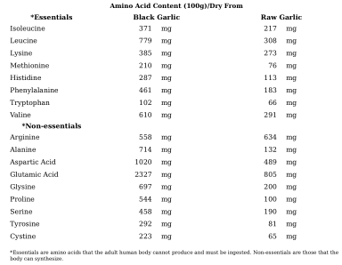 Black garlic is rich in amino acids (AA) these are the building blocks of protein. It is considered a complete protein as it contains all the essential amino acids (EAA) and non essential amino acids. An essential amino acid is important as it has to be eat as the body does not make it, non essential amino acids are made from the amino acids within the body which have been ingested and made. Black garlic is rich in sulphur based amino acids cysteine and methionine, however the fermentation process means black garlic has a far greater amounts:-